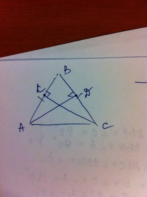треугольник ABD равен треугольнику CKB (по стороне и двум прилежащим к ней углам): угол B - общий, AB=BC (т.к. треугольник равнобедренный), уголBKC=углуBDA (т.к. они образуются высотами, т.е. они оба по 90 градусов). если треугольтники равны, то значит и их соответственные стороны и углы равны, т.е. AD=KC чтд