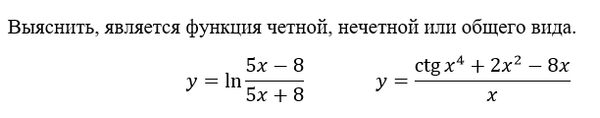 Выяснить, является ли функция четной, нечетной или общего вида. y = ln((5x-8)/(5x+8)) y = (ctgx^4+2x^2-8x)/x