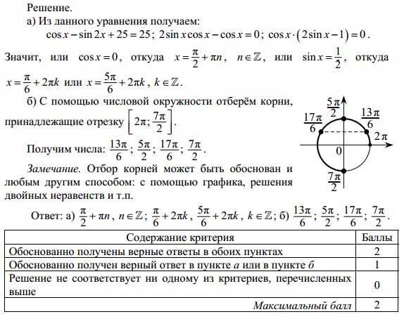 a) Решите уравнение: log5(cosx - sin2x + 25) = 2 б) Найдите все корни этого уравнения, принадлежащие отрезку [2p ; 7p/2]