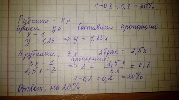 На рынке продаются брюки и рубашки. Известно, что брюки на 25% дороже рубашки. Определите, на сколько процентов три рубашки будут стоить дороже, чем двое брюк.