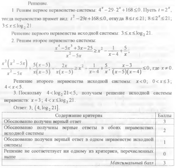 Решите систему неравенств system{4^x-29*2^x+168 меньше или равно 0;(x^4-5x^3+3x-25)/(x^2-5x) больше или равно x^2-1/(x-4)+5/x}