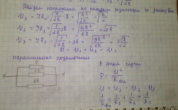 U^2=P1*R(общ1) (из P1=U^2/R(общ1)),R(общ1)=R+2R+3R=6R (т.к. резисторы в первом случае подключены последовательно), P1 дано в условие. U^2=P1*6R