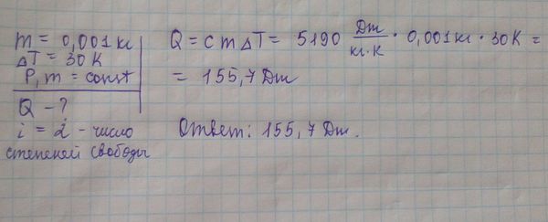 Подставим: Q=(3/2)vRdT+vRdT=(5/2)vRdT=(3/2)(m/M)RdT=155,7 Дж