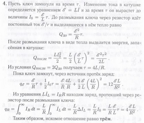 В цепи, схема которой показана на рисунке, все элементы идеальные. Вначале ключ разомкнут, тока в цепи нет. Ключ на некоторое время замыкают, а затем размыкают. После размыкания ключа в цепи выделилось в 7 раз больше теплоты, чем при замкнутом ключе. Найти отношение заряда, прошедшего через источник при замкнутом ключе к заряду, прошедшему через резистор после размыкания ключа.