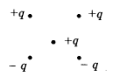 Как направлена (вверх, вниз, влево, вправо, от наблюдателя, к наблюдателю) сила Кулона vector{F}, действующая на положительный точечный заряд +q, помещенный в центр квадрата, в вершинах которого находятся заряды: +q, +q, -q, —q (см. рисунок)? Ответ запишите словом (словами).