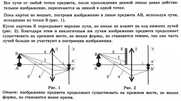 Тонкая линза Л дает четкое действительное изображение предмета АВ на экране Э (рис. 1). Что произойдет с изображением предмета на экране, если верхнюю половину линзы закрыть куском черного картона К (рис. 2)? Постройте изображение предмета в обоих случаях. Ответ поясните, указав, какие физические закономерности вы использовали для объяснения.