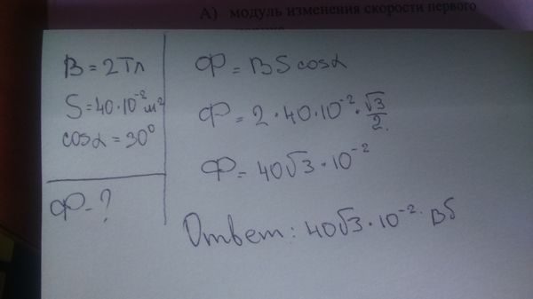 Отсчёт идет от n до B а значит угол равен не 30 градусам а 60 так как 90-30=60 Таким образом ф=B*S*cos60=2*40*10^-4(м^2)*1/2 Ф=4*10^-3 (мВб)
