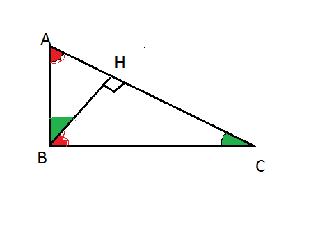 Треугольник АВС - прямоугольный. Его острые углы А и С - разные и отмечены красным и зеленым цветом. Их сумма 90 градусов. Треугольник СВН - тоже прямоугольный. Один угол С у него общий с углом треугольника АВС ( зеленого цвета), значит и второй угол красного цвета, это угол СВН.
