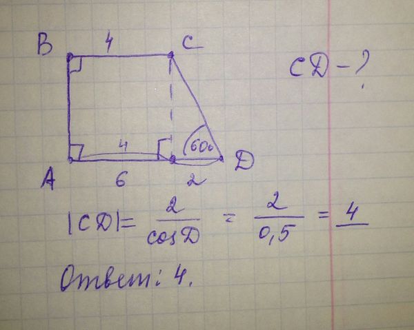 В прямоугольной трапеции ABCD основания AD=6, BC=4, угол D = 60 градусов. Найдите боковую сторону CD.