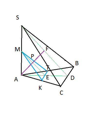 Треугольники SAF и MAР подобны с коэффициентом подобия 2, значит плоскость МКТ делит высоту AF пополам.