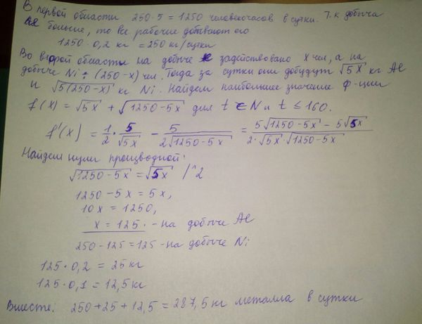 Во второй области каждый день будет вырабатываться 250*5=1250 человеко-часов, т.е. х^2 + у^2 = 1250. За это время будет добыто металлов (х + у) кг.