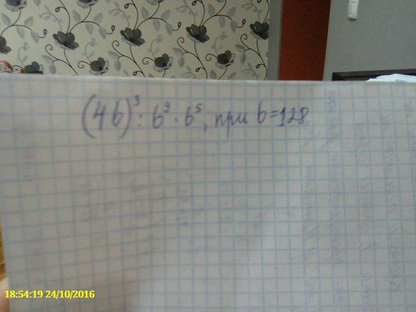 (4b)^3:b^9•b^5 Действия умножения и деления выполняются по порядку (4b)^3=4^3b^3=64b^3 64b^3:b^9=64b^(3-9)=64b^(-6) При делении степеней с одинаковыми основаниями показатели вычитают 64b^(-6)•b^5=64b^(-6+5)=64b^(-1)=64/b При b=128 64/b=64/128=1/2