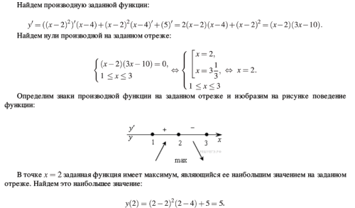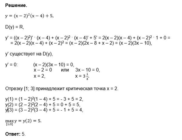 Найдите наибольшее значение функции y=(x-2)^2(x-4)+5 на отрезке [1;3].