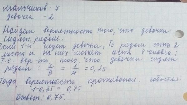 Найдите вероятность того, что при рассадке случайным образом за круглым столом группы, состоящей из 7 мальчиков и 2 девочек, девочки не будут сидеть рядом.