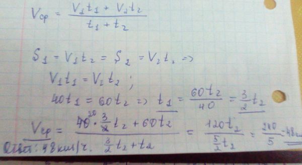 Автомобиль ехал первую половину пути со скоростью 40 км/ч, а вторую половину пути — со скоростью 60 км/ч. Найдите среднюю скорость движения автомобиля на всем пути. Ответ дайте в кило-метрах в час.