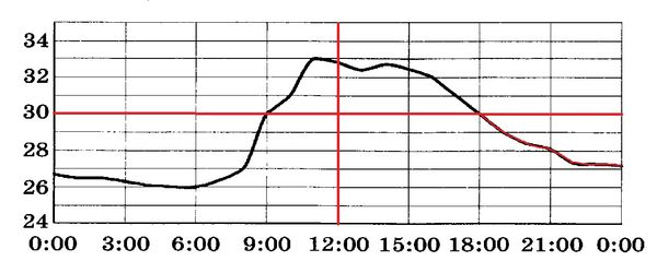 На рисунке показано, как изменялась температура на протяжении суток. по горизонтали указано время суток, по вертикали - значение температуры в градусах Цельсия. Сколько часов во второй половине суток температура не превышала 30°С?
