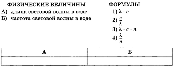 Пучок света переходит из воздуха в воду. Скорость света в воздухе - с, длина световой волны в воздухе - ?, показатель преломления воды, относительно воздуха - n. Установите соответствия между физическими величинами и формулами, по которым их можно рассчитать.
