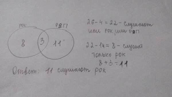 В классе учится 26 учащихся. Несколько из них слушают рок, 14 человек слушают рэп, причем и рок, и рэп слушают всего лишь трое. Известно, что четверо не слушают ни рок, ни рэп. Сколько человек из класса слушают рок?