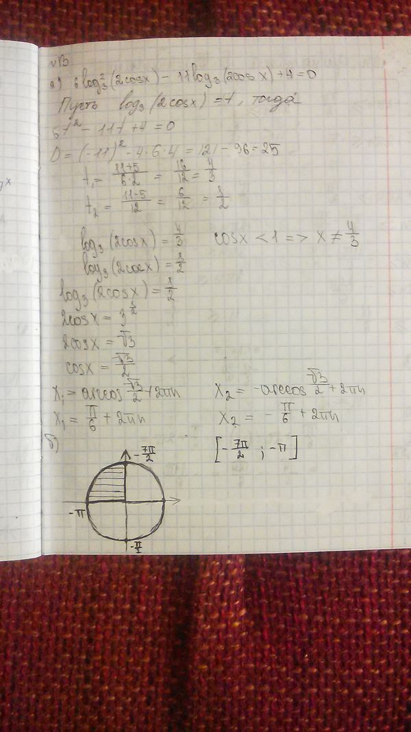 а) Решите уравнение 6log^2_(3)(2cosx)-11log3(2cosx)+4=0 б) Укажите корни этого уравнения, принадлежащие отрезку [-7Pi/2; -Pi]