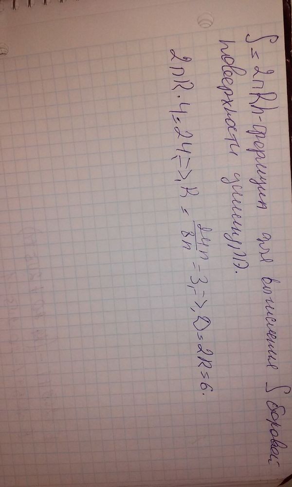 Площадь боковой поверхности цилиндра равна 24n,а его высота равна четыре. Найдите диаметр основания цилиндра.