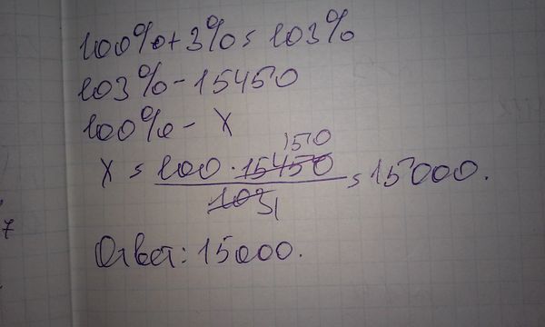 Цена на телевизор была повышена на 3% и составила 15450 рублей. Сколько рублей стоил телевизор до повышения цены