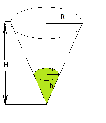 h=(3/7)*H r=(3/7)*R v(жидкости):V=(3/7)^3 V=(7/3)^3*v V-v=(7/3)^3*v-v=(343*v/27)-v=316*v/27=(316*270)/27 мл= =3160 мл нужно долить.