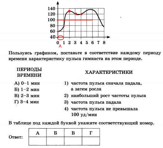 Пользуясь графиком, поставьте в соответствие каждому периоду времени характеристику пульса гимнаста на этом периоде.