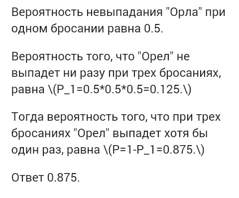 Монету бросают трижды. Какова вероятность, что в результате хотя бы один раз выпадет «Орел»?