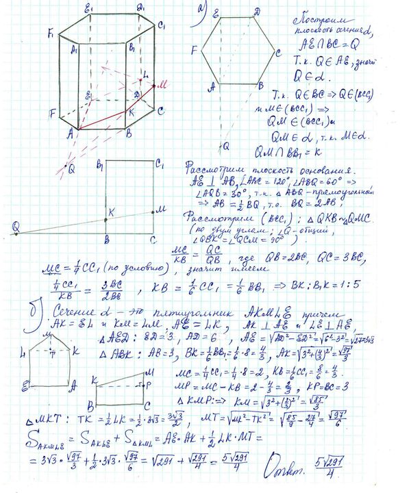 В правильной шестиугольной призме ABCDEFA1B1C1D1E1F1 на ребре СС1 отмечена точка М так, что СМ:С1М=1:3. Плоскость АЕМ пересекает ребро ВВ1 в точке К.