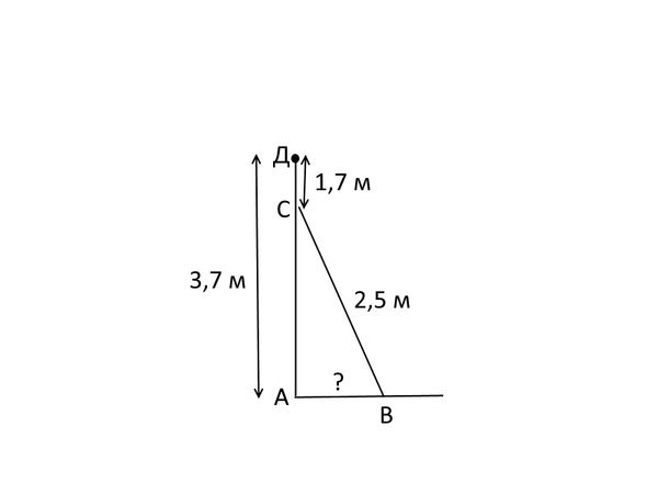 Электрику ростом 1,7 метра нужно поменять лампочку, закреплённую на стене дома на высоте 3,7 метра. У него есть лестница длиной 2,5 метра. На каком наибольшем расстоянии от стены должен быть установлен нижний конец лестницы, чтобы с последней ступеньки электрик достал до лампочки? Ответ дайте в метрах.