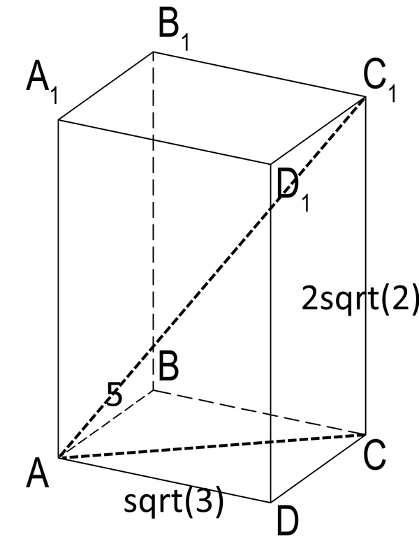 В прямоугольном параллелепипеде АВСDA1B1C1D1 AB=5, AD=sqrt(3), CC1=2sqrt(2). Найдите длину диагонали параллелепипеда АС1.