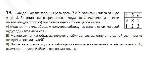 В) После нескольких ходов в таблице оказались восемь нулей и какое‐то число N, отличное от нуля. Найдите все возможные N.