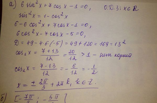 а) Решите уравнение 6sin^2x+7cosx-1=0 б) Найдите все корни этого уравнения, принадлежащие отрезку [-7Pi/2; -5Pi/2]