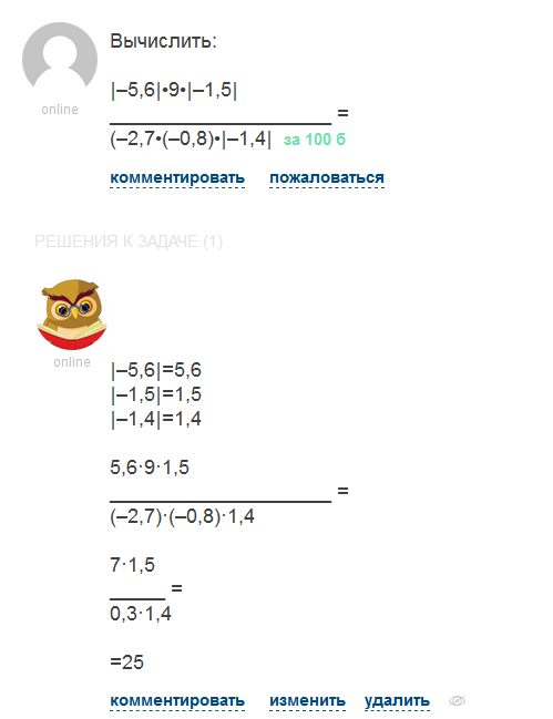 Вычислить |-5,6|*9*|-1,5| / -2,7*(-0,8)*|-1,4|