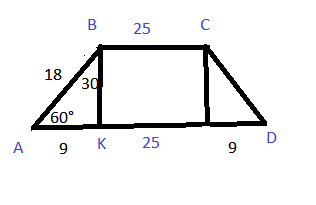 ABCD - трапеция, ВD параллельно АD, AB=CD. Угол В = 120 градусов, ВС = 25 см, АВ = 18 см, ВК - высота. ВК = 9 в Корне 3 или 15,5885. Найти площадь трапеции.