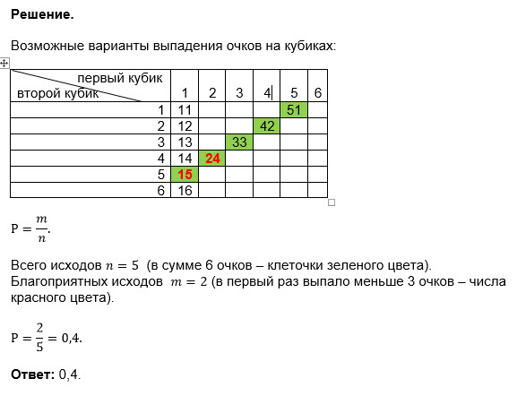 Всевозможные исходы: 2+4 - подходит 1+5 - подходит 3+3 4+2 5+1 P=2/5=0.4 Ответ: 0.4