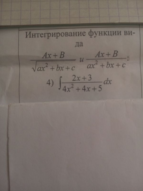 4x^2+4x+5=(4x^2+4x+1)+4=(2x+1)^2+4 Замена 2x+1=t x=(t-1)/2 dx=dt/2 2x+3=t+2 ∫(2x+3)dx/(4x^2+4x+5)=∫((t+2)*dt/2)/(t^2+4)= =(1/2)∫tdt/(t^2+4)+∫dt/(t^2+2^2)= =(1/4)ln|t^2+4|+(1/2)*arctg(t/2)+C, t=2x+1