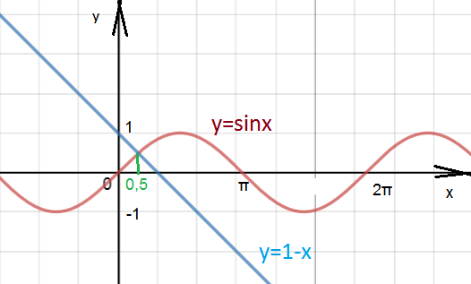 Строим графики функций у= sinx и у=1-х.