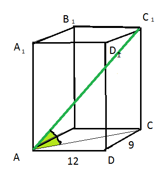 В основании параллелепипеда прямоугольник АВСD. По теореме Пифагора: AC^2=AD^2+DC^2=12^2+9^2=144+81=225. АС=15. Треугольник АСС1- прямоугольный равнобедренный. АС=СС1=15