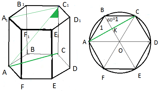 В основании призмы правильный шестиугольник, все стороны которого равны 1, все углы 120 градусов. Найдем АС по теореме косинусов из треугольника АВС. АС^2=AB^2+BC^2-2*AB*BC*cos120 градусов= =1+1+1=3 АС=sqrt(3) Рассмотрим прямоугольный треугольник АС_(1)С. СС_(1)=1 АС=sqrt(3) tg∠AC_(1)C=AC/CC_(1)=sqrt(3)/1=sqrt(3) ∠AC_(1)C=60 градусов.