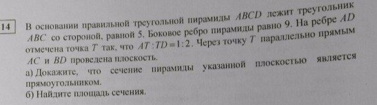 В основании правильной треугольной пирамиды ABCD лежит треугольник ABC со стороной, равной 5. Боковое ребро пирамиды равно 9. На ребре AD отмечена точки T так, что AT:TD = 1:2. Через точку T параллельно прямым AC и BD проведена плоскость.