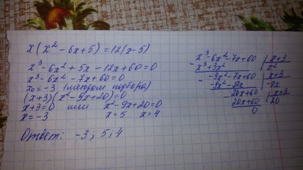 Решите уравнение х(х^2-6х+5) = 12(х-5)....