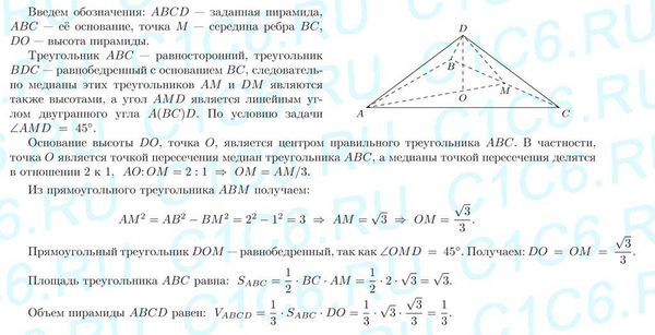Сторона основания правильной треугольной пирамиды равна 2, а двугранный угол при основании равен 45. Найдите объем пирамиды.