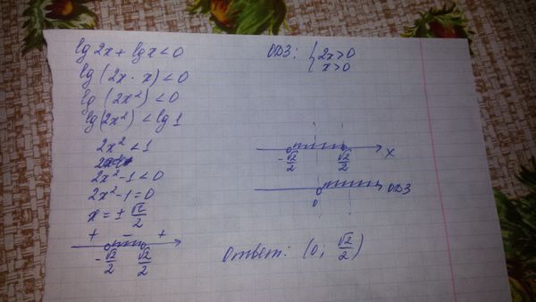 Наверное, неравенство имеет такой вид: lg^2x+lgx < 0 Решение. ОДЗ:х > 0 lgx*(lgx+1) < 0 Применяем обобщенный метод интервалов: lgx=0 или lgx=-1 x=1 или х=0,1 отмечаем полученные точки на ОДЗ=(0;+ бесконечность) (0) _+__ (0,1) _-_ (1) _+_ О т в е т. (0,1;1)