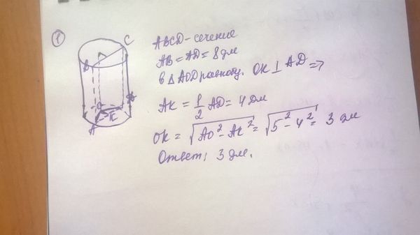 2.Нужно найти радиус сечения. Найдем его через прямоугольный треугольник, где гипотенуза - радиус сферы, катет - высота - расстояние до сечения. По Т. Пифагора r=