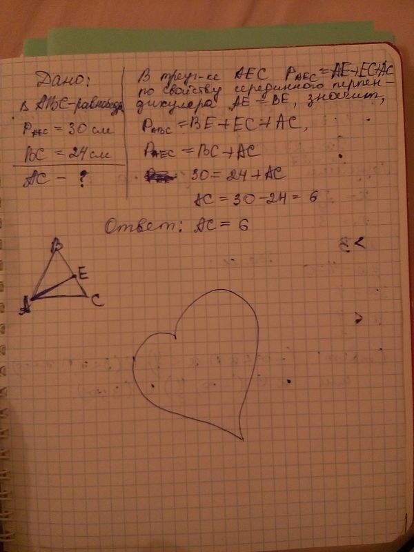 Перпендикуляр к стороне AB треугольника ABC пересекает сторону BC в точке E. Найдите AC, если BC = 24 см, а периметр треугольника AEC равен 30 см.