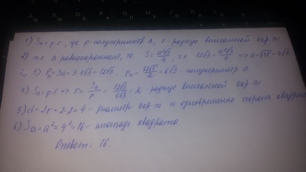 Площадь правильного треугольника 12sqrt(3). Найти площадь квадрата, сторона которого равна диаметру вписанного в треугольник круга.