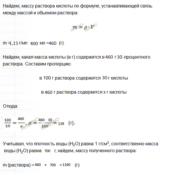 к 400 мл 30% кислоты плотностью 1,15 прибавили 0,7 кг воды. определите массовую долю кислоты в полученном растворе