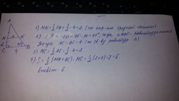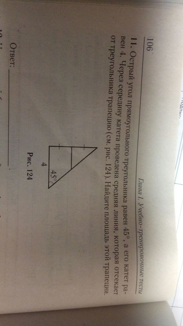 Острый угол прямоугольного треугольника равен 45 , а его кати и вен 4. Через середину катета проведена средняя линия, которая от треугольника трапецию (см. рис. 124). Найдите площадь этой трапеции.
