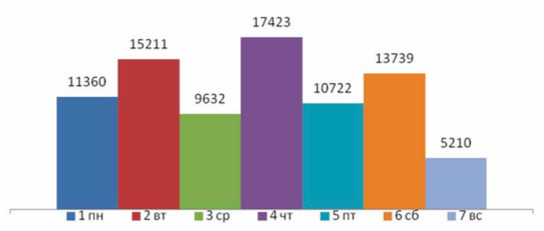 На диаграмме приведено количество шагов, пройденных школьником в течении каждого дня недели. Через сколько дней выполнена недельная норма шагов, которая составляет 60 000.